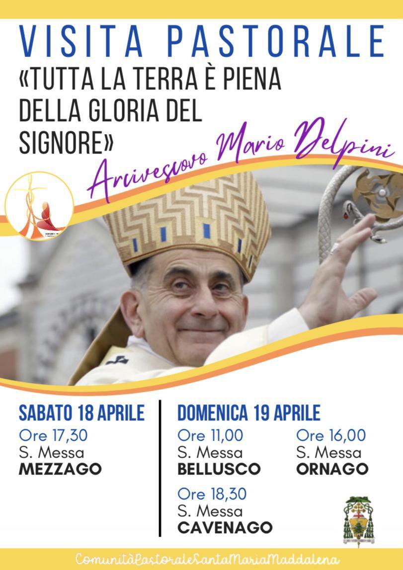 Ecco il volantino dell'imminente visita pastorale del vescovo di Milano Mario Delpini nella nostra comunità. Sono sopra scritti gli appuntamenti di ogni parrocchia.